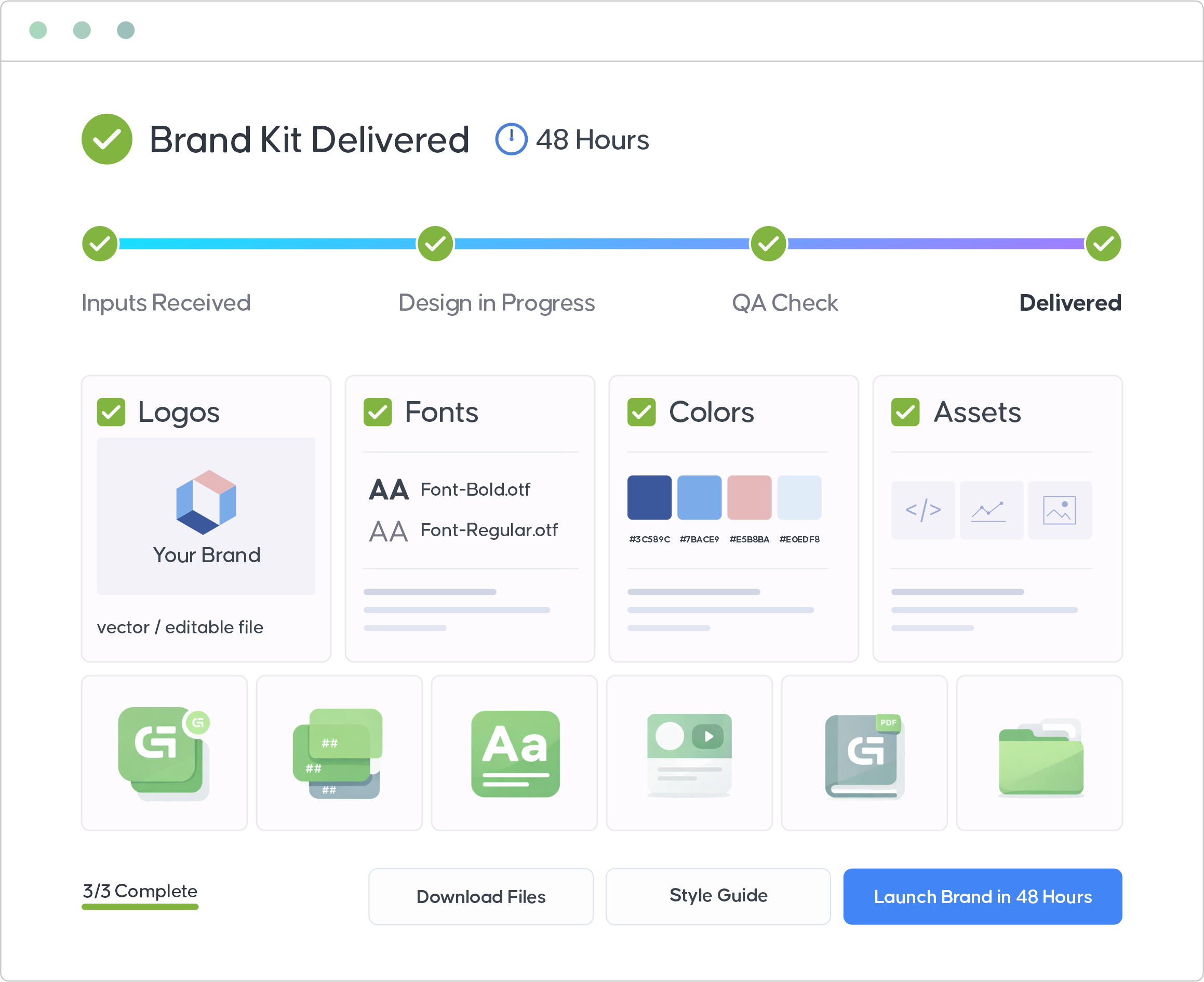 Your complete brand kit is delivered within 48 hours of submitting your brand inputs.